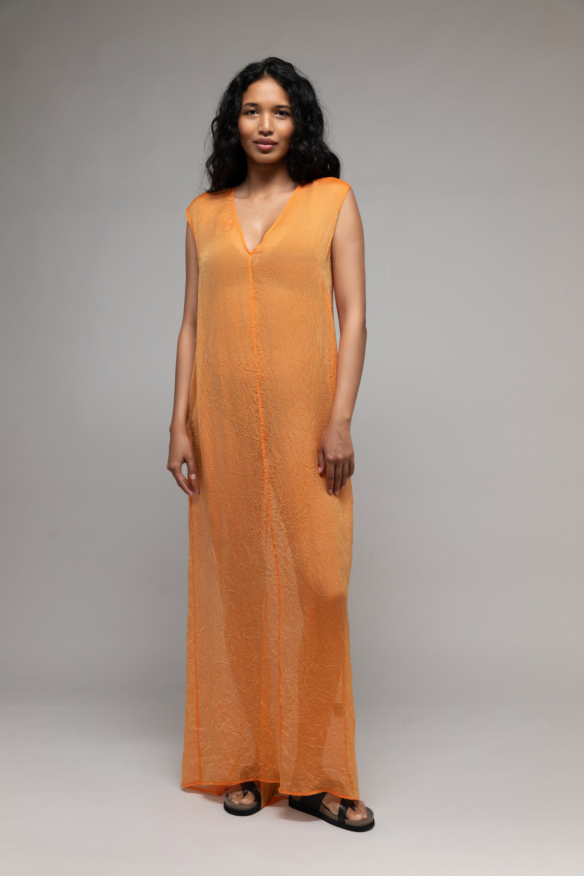 Sheer caftan dress made from flowing, sheer fabric. Deep v-neck and french seams. Wear this dress as a layering piece or throw it over your swimsuit for a poolside dinner.