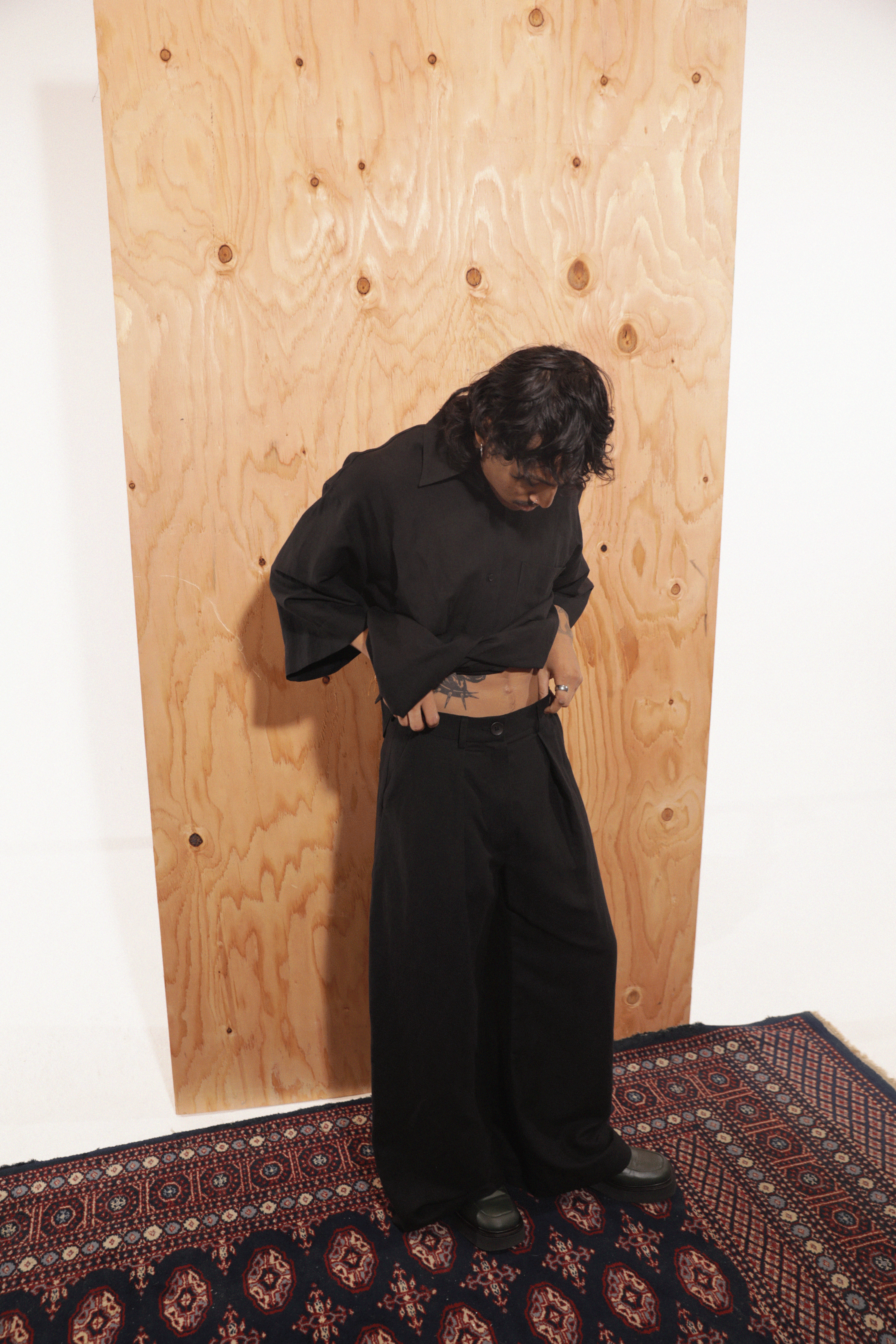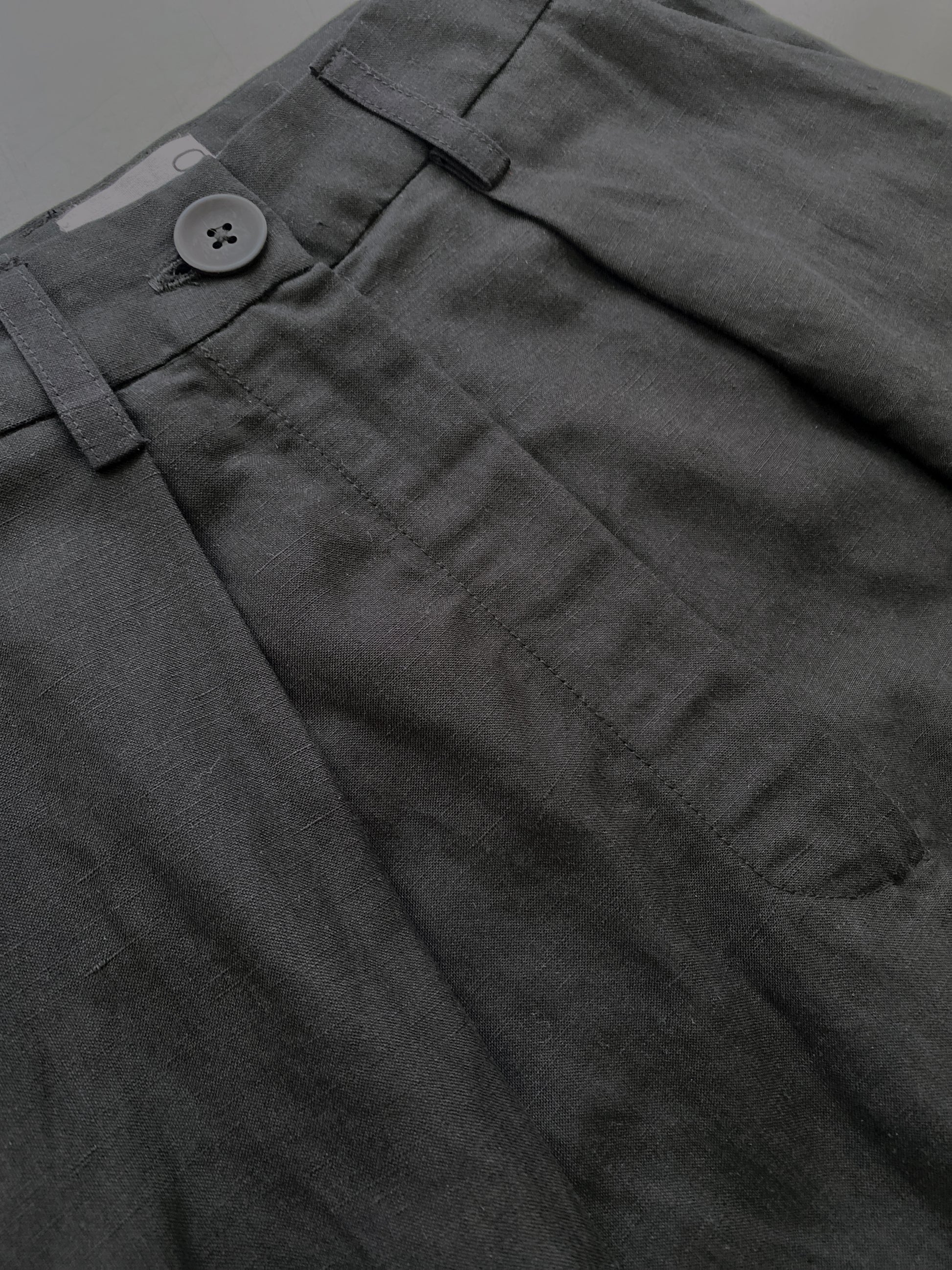 Deep Pleat Trouser in Black Washed Silk-Linen Blend
