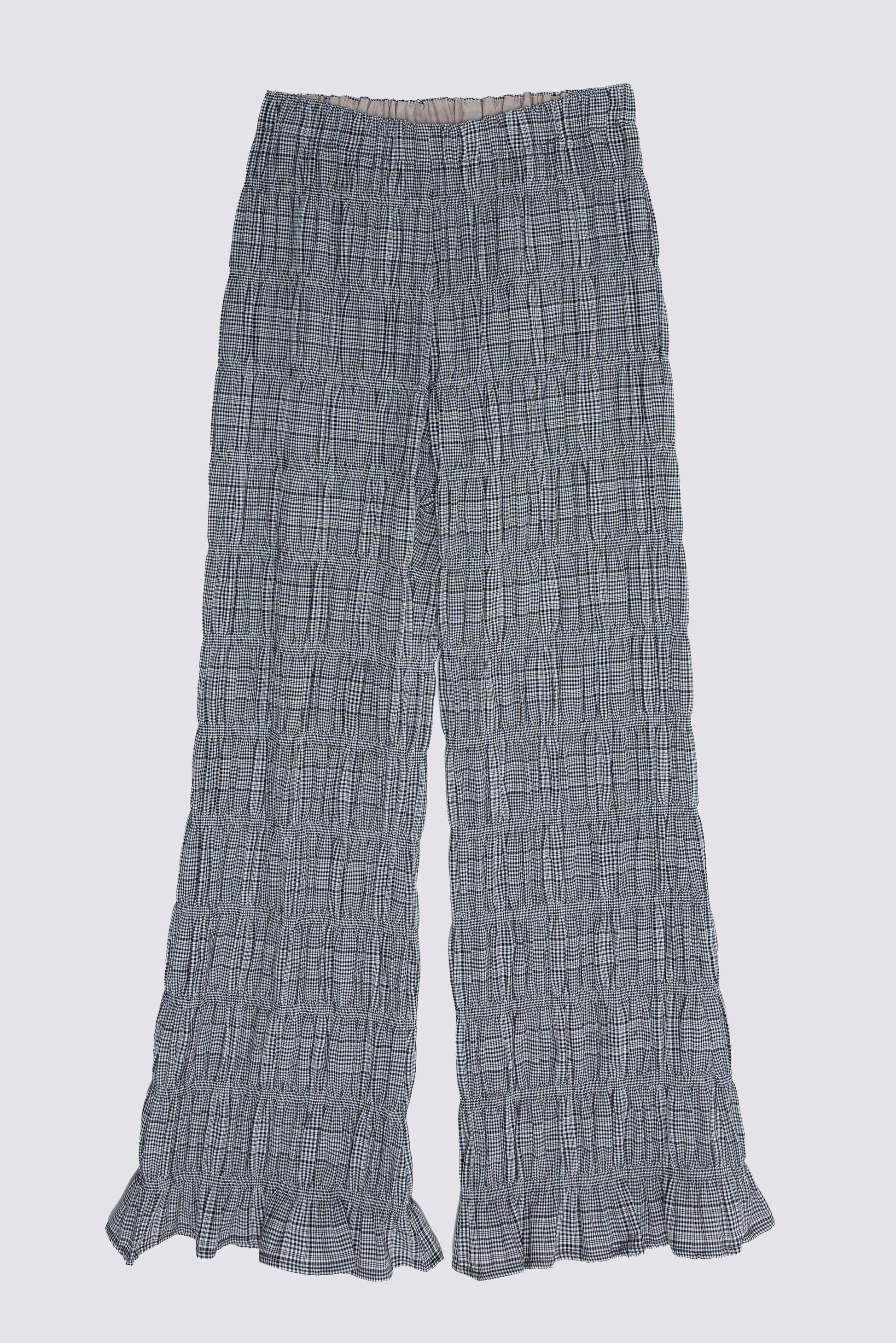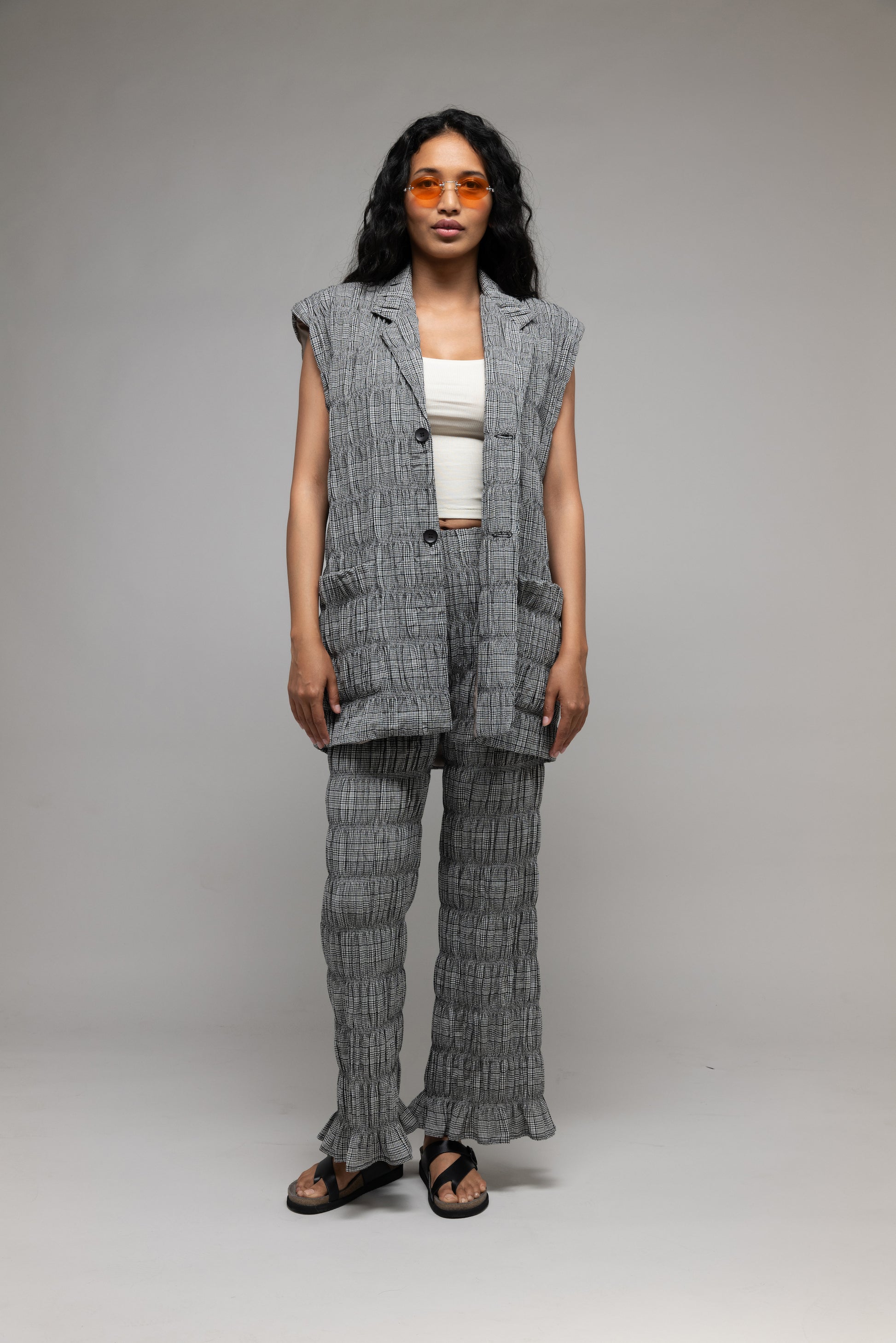 Black and white gingham print trousers with a unique gathered texture made from deadstock fabric. Elastic waistband is lined in silk, leg is relaxed with a slight flare. Pair with the Oversized 2-Button Vest for a standout look.